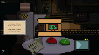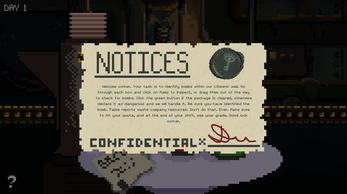 Welcome worker. Your task is to identify bombs within our citizens' mail. Go through each box and click on items to inspect, or drag them out of the way to check for bombs. Click the green button if the package is cleared, otherwise declare it as dangerous and we will handle it. Be sure you have identified the bomb. False reports waste company resources. Don't do that. Ever. Make sure to hit your quota, and at the end of your shift, see your grade. Good luck worker.